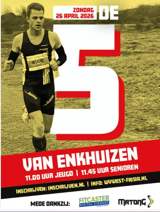 De 5 van Enkhuizen is een nieuw hardloopevenement dat op zondag 26 april 2026 voor het eerst plaatsvindt in Enkhuizen. Het evenement biedt afstanden aan voor diverse leeftijden, waaronder jeugdwedstrijden, en is gericht op lopers, supporters en vrijwilligers. Inschrijven kan via inschrijven.nl.