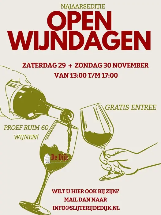 Am Samstag, den 29. November oder Sonntag, den 30. November können Sie in der Slijterij de Dijk mehr als 60 sorgfältig ausgewählte Weine verkosten.