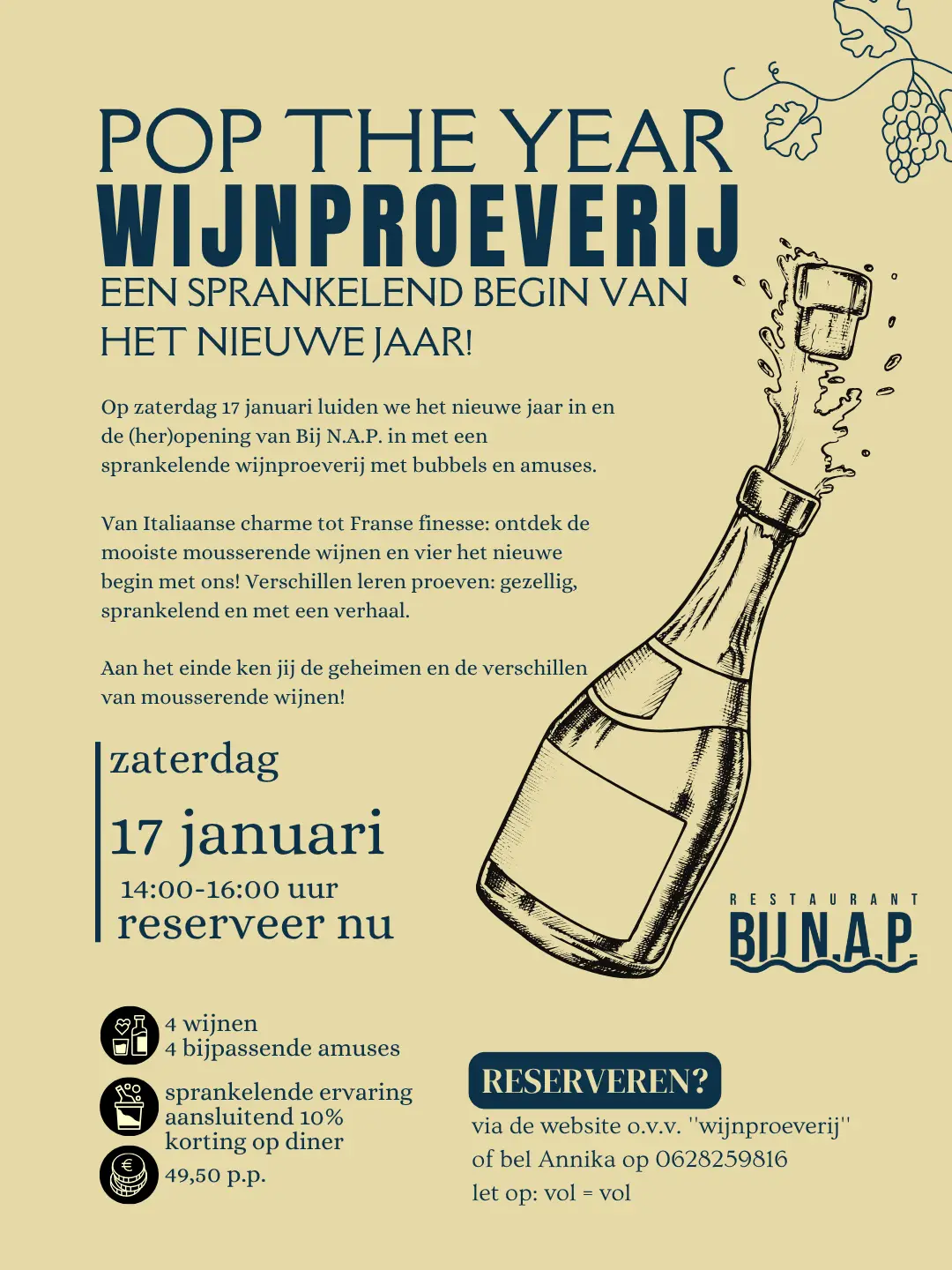 Am Samstag, den 17. Januar, begrüßen wir das neue Jahr und die (Wieder-)Eröffnung von Bij NAP mit einer Sektprobe, bei der prickelnde Weine und Appetithäppchen serviert werden. Von italienischem Charme bis hin zu französischer Finesse: Entdecken Sie die edelsten Schaumweine und feiern Sie mit uns den Neubeginn! Lernen Sie, die Unterschiede zu schmecken: gesellig, prickelnd und mit einer Geschichte.