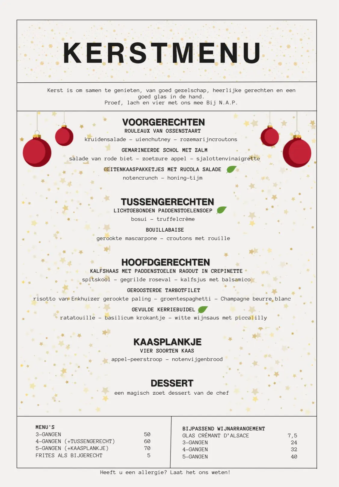 Op Kerstavond (24 december) en Eerste Kerstdag (25 december) zijn wij geopend om de kerst met jullie te vieren! We hebben een feestelijk kerstmenu voorbereid met optioneel een bijpassend wijnarrangement.