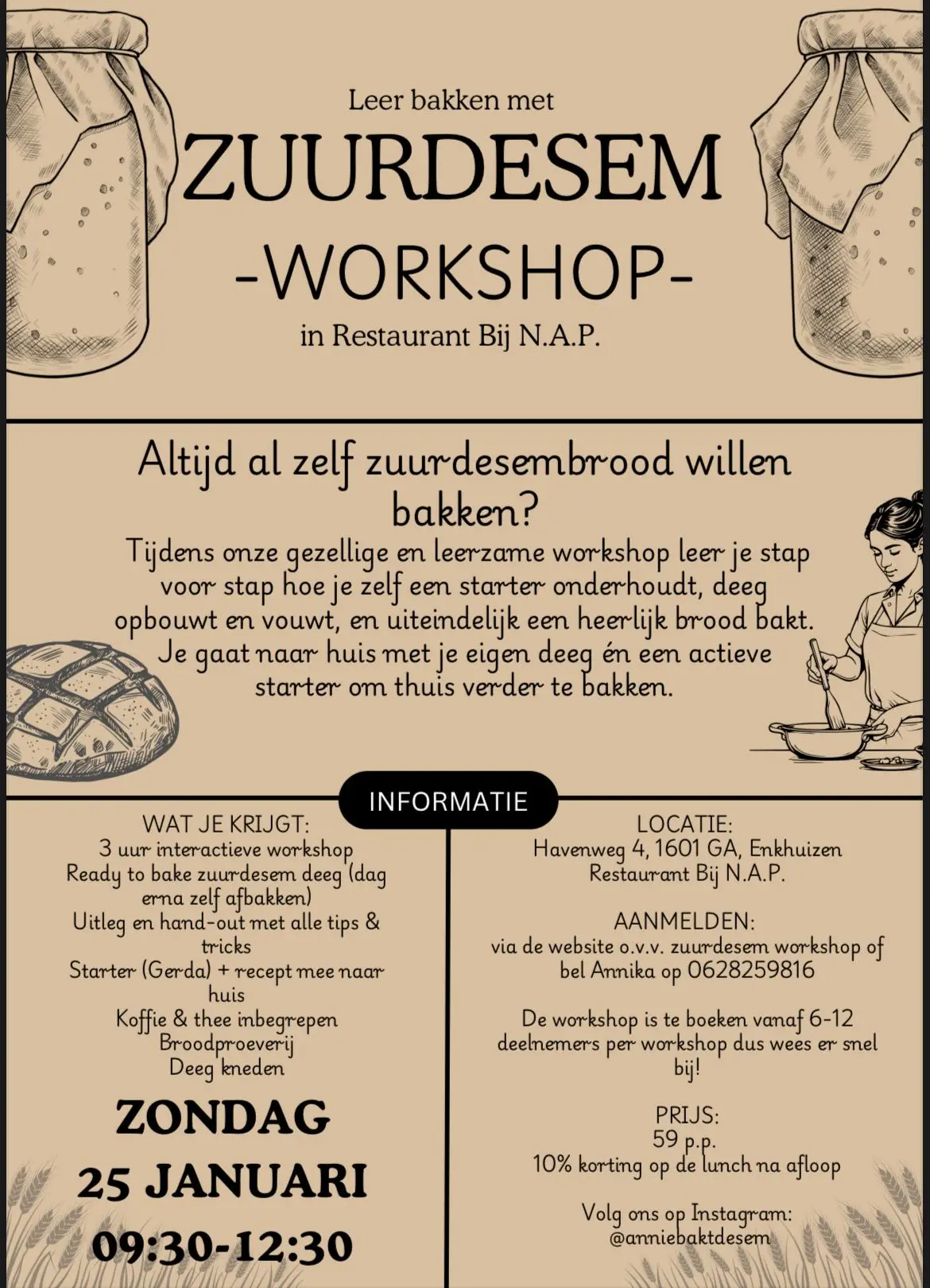 Tijdens onze gezellige en leerzame workshop leer je stap voor stap hoe je een starter onderhoudt, deeg opbouwt en vouwt, en uiteindelijk een heerlijk brood bakt. Je gaat naar huis met je eigen deeg én een actieve starter om thuis verder te bakken. Inclusief ready to bake deeg, uitleg en hand-out met alle tips & tricks, starter Gerda + recept mee naar huis, koffie & thee, broodproeverij en deeg kneden.