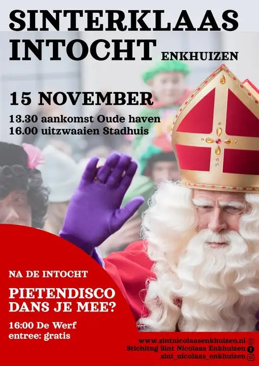 Zaterdag 15 november meert de stoomboot af in de prachtige haven van Enkhuizen. Aan boord Sint Nicolaas met zijn complete pietenlegioen. Zij worden gepast ontvangen op het bordes van het Snouck van Loosenhuis en nemen uitgebreid de tijd om iedereen te verwelkomen. Daarna volgt een feestelijke rondgang door de binnenstad. De optocht eindigt bij het stadhuis aan de Breedstraat.