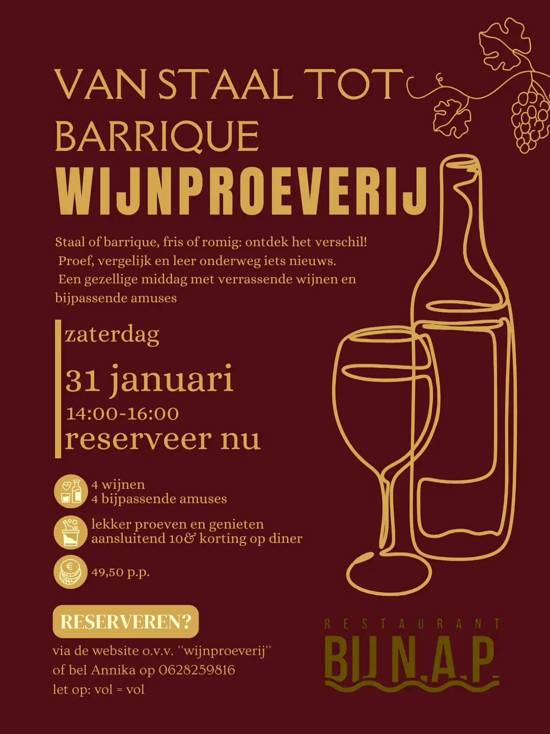 We nodigen je uit om de wijnproeverij van vier bijzondere wijnen met vier bijpassende amuses bij te wonen. Wat is nou eigenlijk het verschil? Wat doet dit met de wijn? Ontdek het zelf tijdens deze gezellige middag!